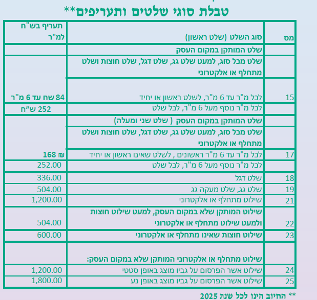 התעריפים להצבת שילוט על סוגיו השונים מפורטים בחוק העזר ליהוד מונוסון (מודעות ושלטים), התשפ"ה 2025 .