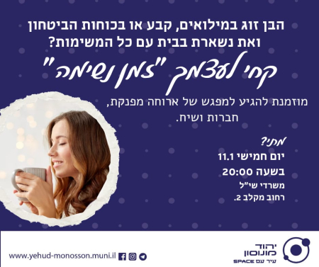 מרכז צעירים עירוני, NEXT_דור -מרכז הצעירים הוא הבית של צעירי יהוד-מונוסון בגילאי 18-40. חיילים משוחררים, משרתי מילואים ומשפחותיהם, סטודנטים.יות, זוגות צעירים, יזמים ובעלי עסק, אצלנו תמצאו במהלך השנה מגוון פעילויות, הרצאות, סדנאות וקורסים במגוון תחומים הנוגעים לכם.