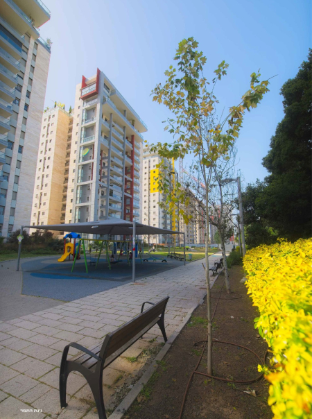 של מדשאות ומתקני משחק מצפון ומדרום לרחוב מרבד הקסמים.